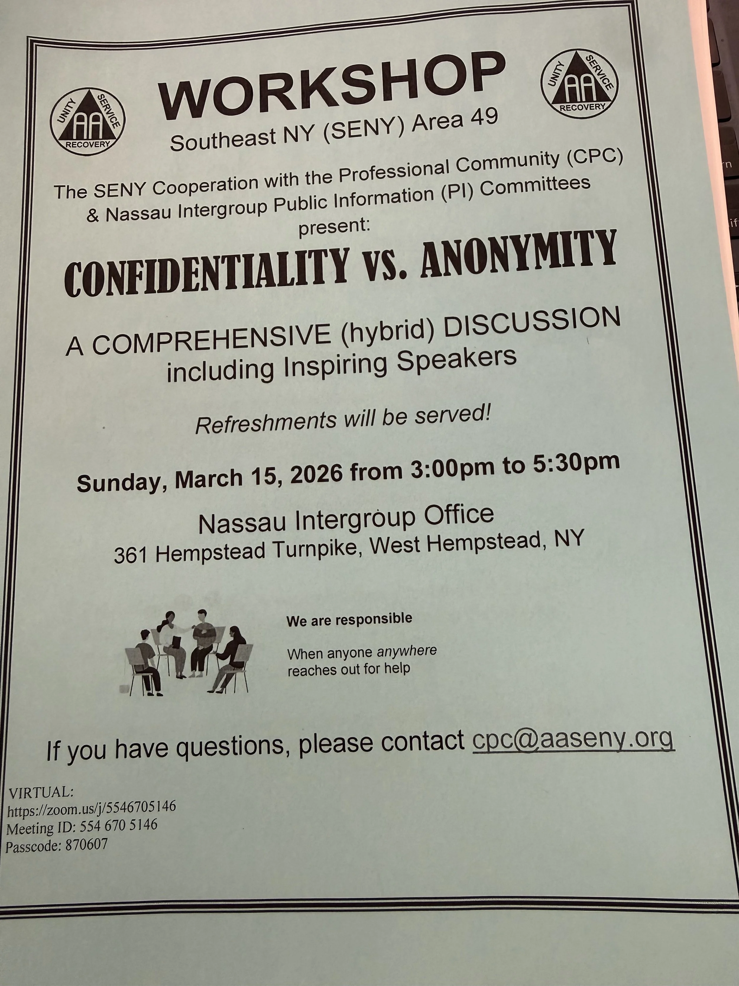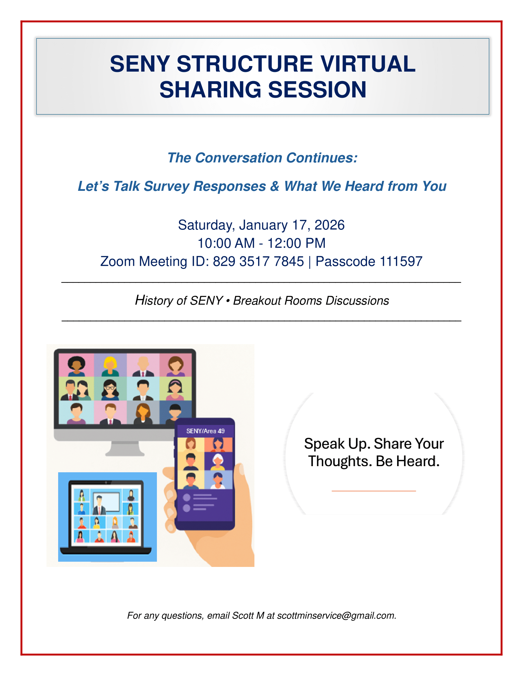 The purpose of NERAASA is for General Service Representatives (GSR’s), District Committee Members (DCM’s), Area Officers, Area Committee Members, District Committee Members, and Intergroup/Central Office Representatives of the Northeast Region to discuss General Service Conference related issues and concerns affecting A.A. as a whole, as well as pertinent aspects of recovery, unity and service common to the areas of the Northeast Region.